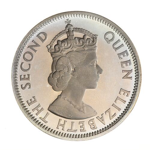 Crowned bust of the queen facing right; around, QUEEN ELIZABETH THE SECOND; artist's initials, CT, incuse on bust truncation