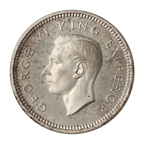 King's head, bare, facing left; around, GEORGE VI KING EMPEROR; below neck truncation in small letters the artist's initials HP ([Thomas] Humphrey Paget)