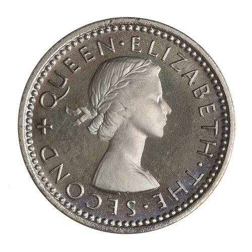 Laureate bust right; around, + QUEEN ELIZABETH THE SECOND; artist's initials incuse on neck truncation, MG (Mary Gillick)
