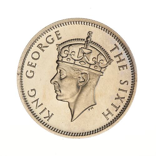 The year 1950 saw Mauritius move away from coinage in silver. Copper-Nickel was introduced for the Rupee, 1/2 Rupee and 1/4 Rupee denominations with large numbers ordered from the Royal Mint, London to allow for the removal of the old silver pieces. This coin is a Proof of Record reference piece supplied by the Royal Mint to the National Gallery of Victoria through the Melbourne Branch of the Royal Mint.