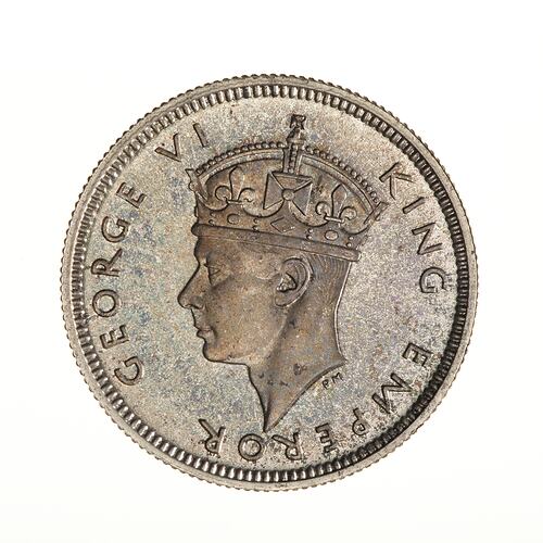 George VI acceded to the British throne in December 1936 with his coronation occuring on 12 May 1937. Mauritius was well supplied with coins at this time although there was a call for additional 1/4 rupee pieces in early 1937. The Royal Mint was unwilling to issue coins showing the king wearing a crown until after 12 May so that need was filled by striking additionakl coina of George V with the date 1936. It was 1938 before further coins were needed with 2,000,000 1/4 rupees and 200,000 rupees being struck that year. The Royal Mint, at that time, manufactured special Proof of Record coins for select reference collections. This coin was provided for the National Gallery of Victoria through the Melbourne Branch of the Royal Mint.