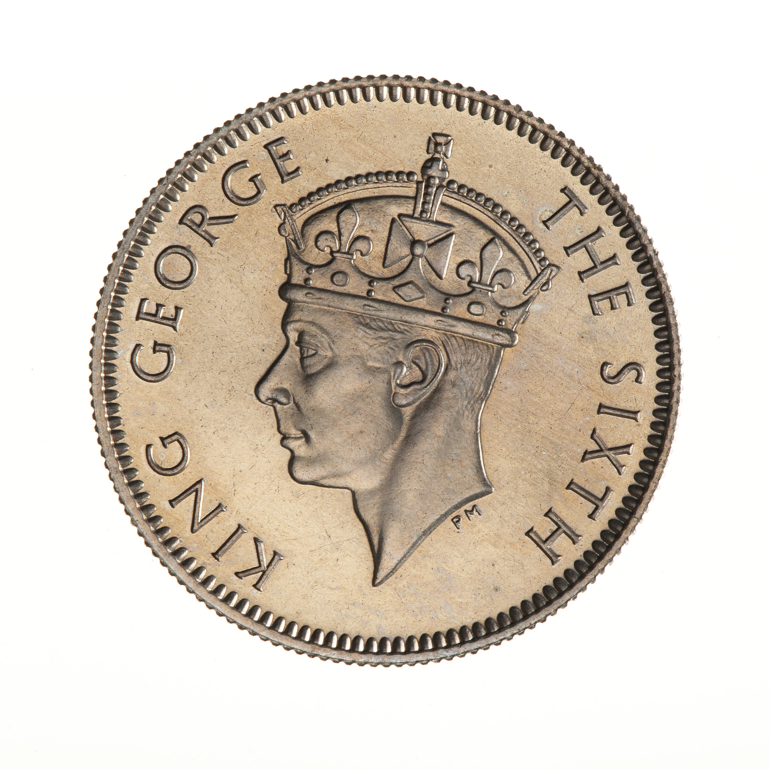 Crowned head of the King facing left; around, KING GEORGE THE SIXTH; the artist's initials, HP, below neck truncation