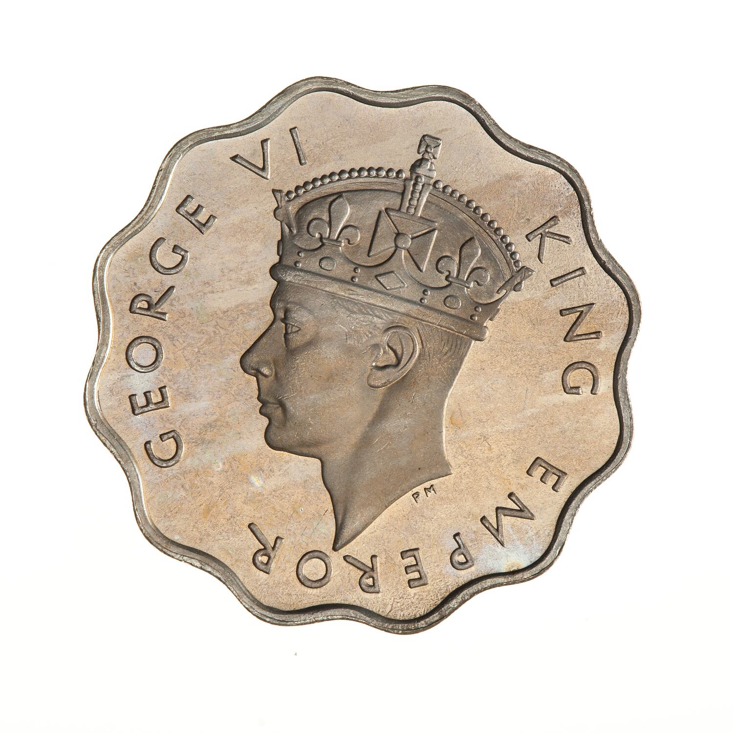 Crowned head of the King facing left; around, GEORGE VI KING EMPEROR; the artist's initials, HP, below neck truncation