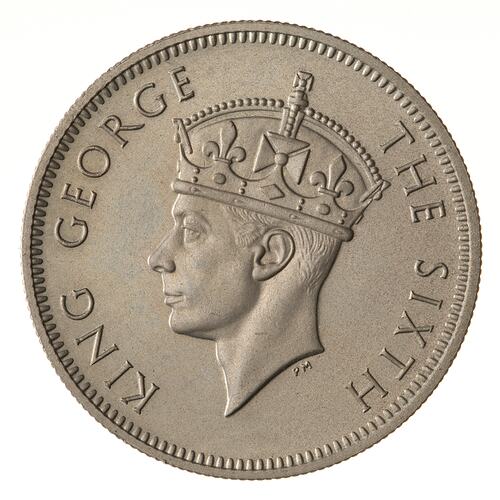 Crowned head of the King facing left; around, KING GEORGE VI THE SIXTH; artist's initials, PM, below neck