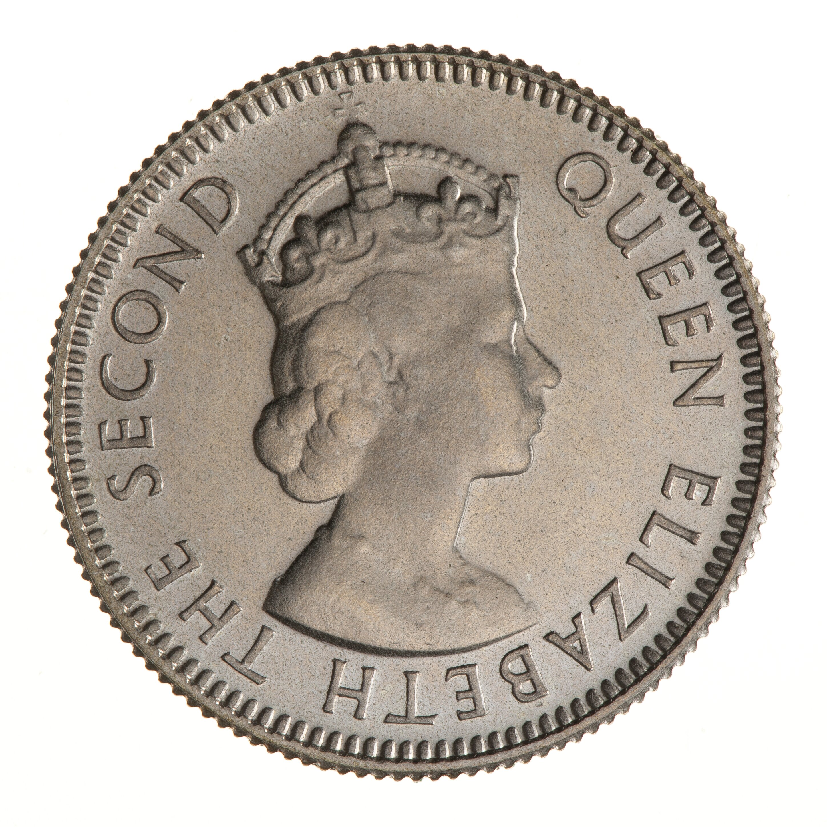 This is a Proof of Record example of the first issue in the name of Elizabeth II for Malaya and British North Borneo, in 1953 the 5 and 10 cents denominations were issued and in 1954 the 20 and new 50 cents pieces. This coin was supplied to the Melbourne Branch of the Royal Mint from London and then to the National Gallery of Victoria.