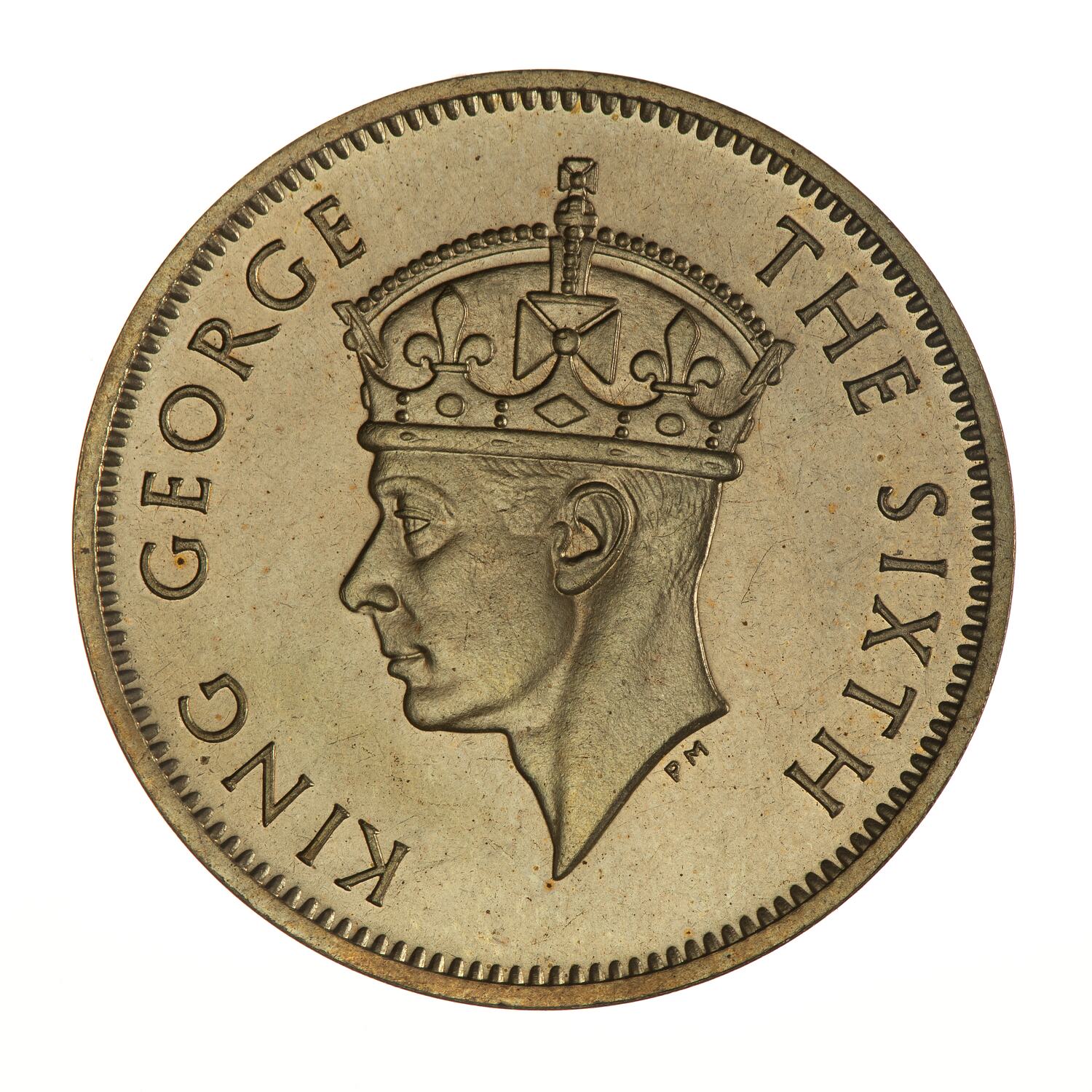 A crowned head of the King facing left; around, KING GEORGE THE SIXTH; below head the artist's initials, PM