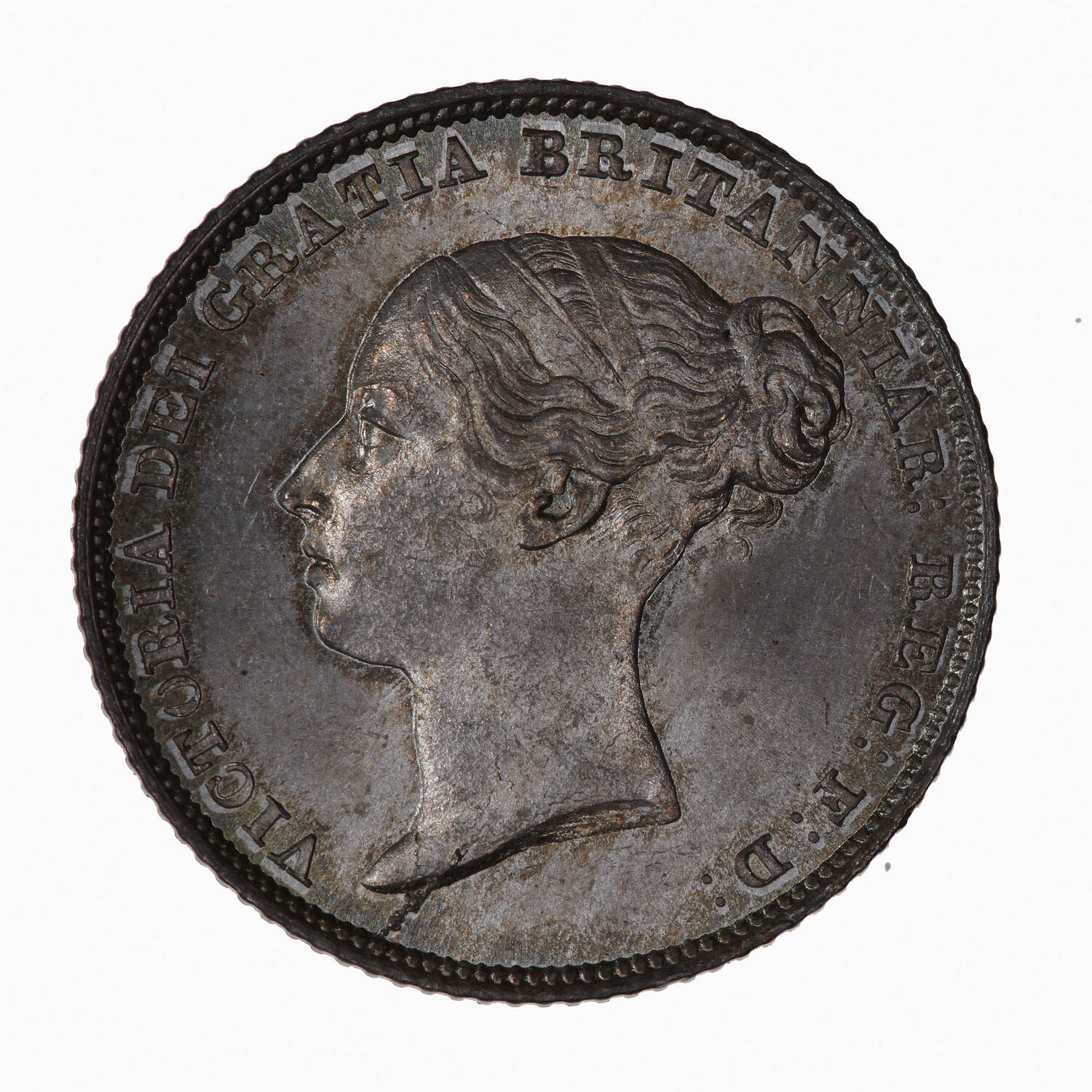 Head of the Queen facing left, ribbon in hair; around, VICTORIA DEI GRATIA BRITANNIAR: REG: F:D: