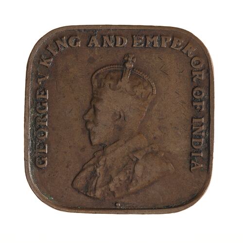 Bust of the King wearing the Imperial crown and an ermine robe with the collar of the Garter and the badge of the Bath; around, GEORGE V KING AND EMPEROR OF INDIA; the artist's initials BM on bust truncation