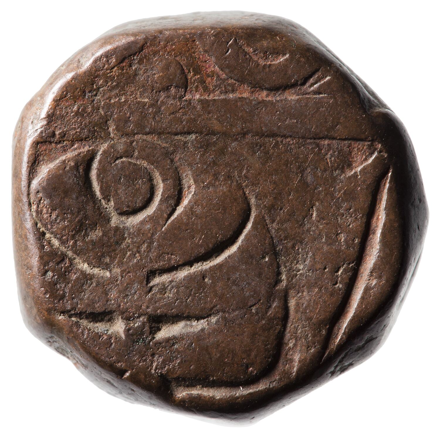 1 Paisa coin, issued by either Maharaja Madho Singh I (1750-1768) or Maharaja Prithvi Singh II (1768-1778) of the Jaipur Princely State, India.