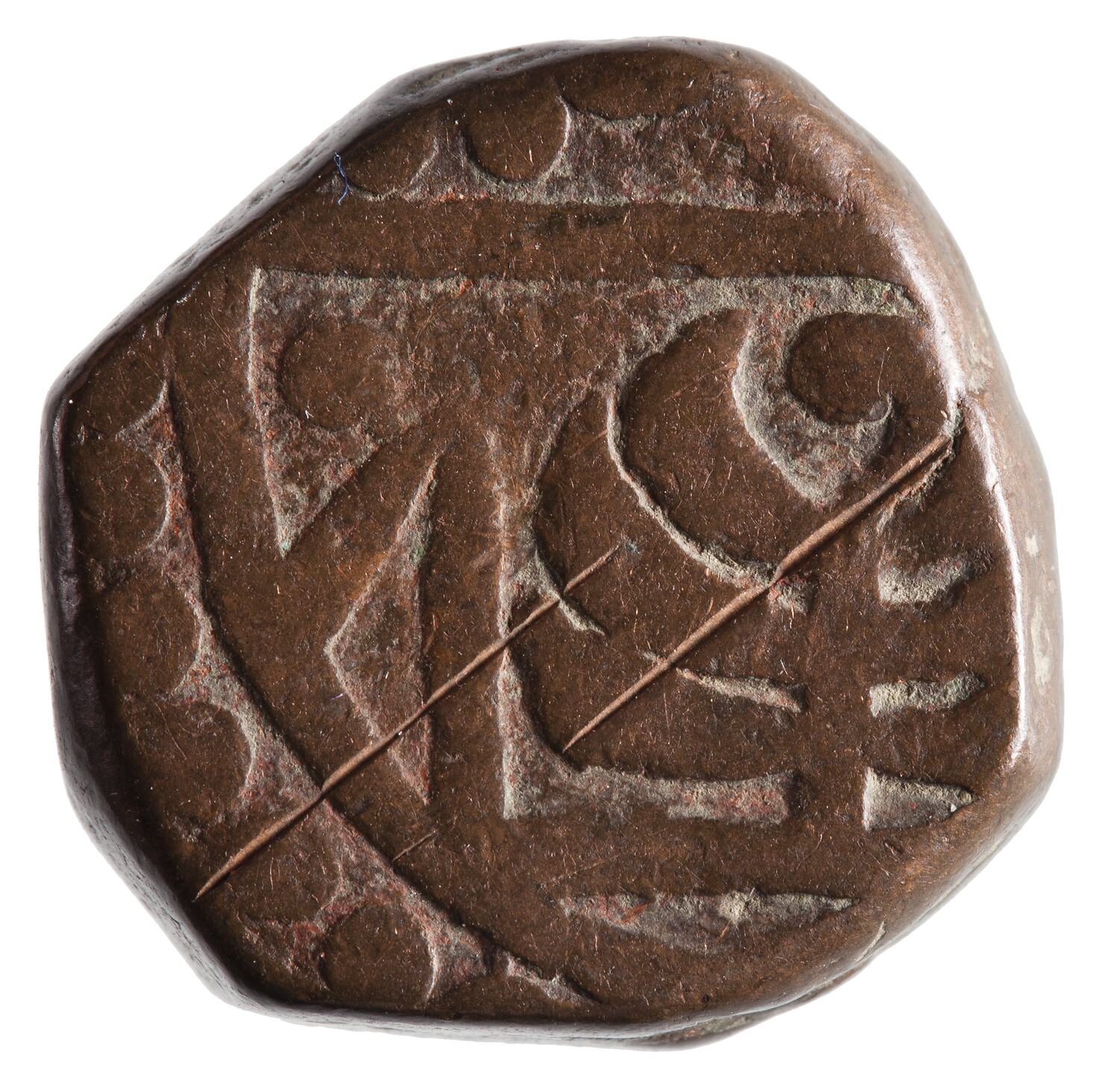 1 Paisa coin, issued by either Maharaja Madho Singh I (1750-1768) or Maharaja Prithvi Singh II (1768-1778) of the Jaipur Princely State, India.