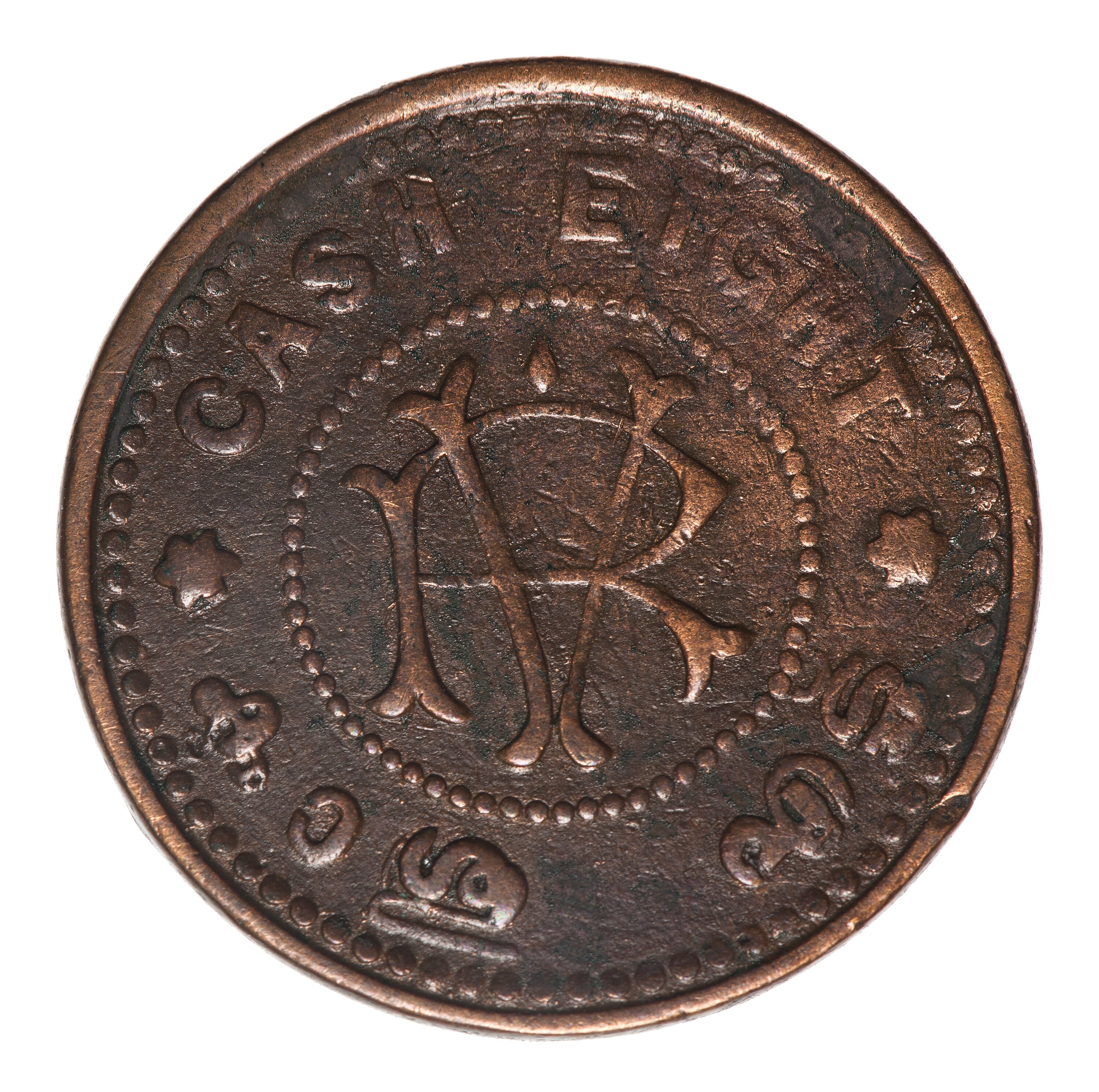 At centre within a circle of beads, the monogram RV (Rama Varma); around above, CASH EIGHT; around below, legend