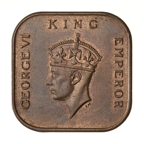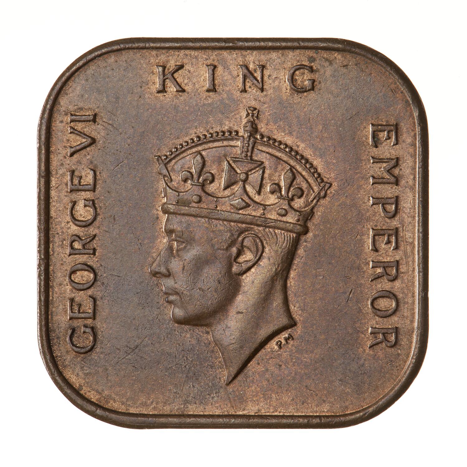 Crowned head of the King facing left; around, GEORGE VI KING EMPEROR; artist's initials, PM, below neck