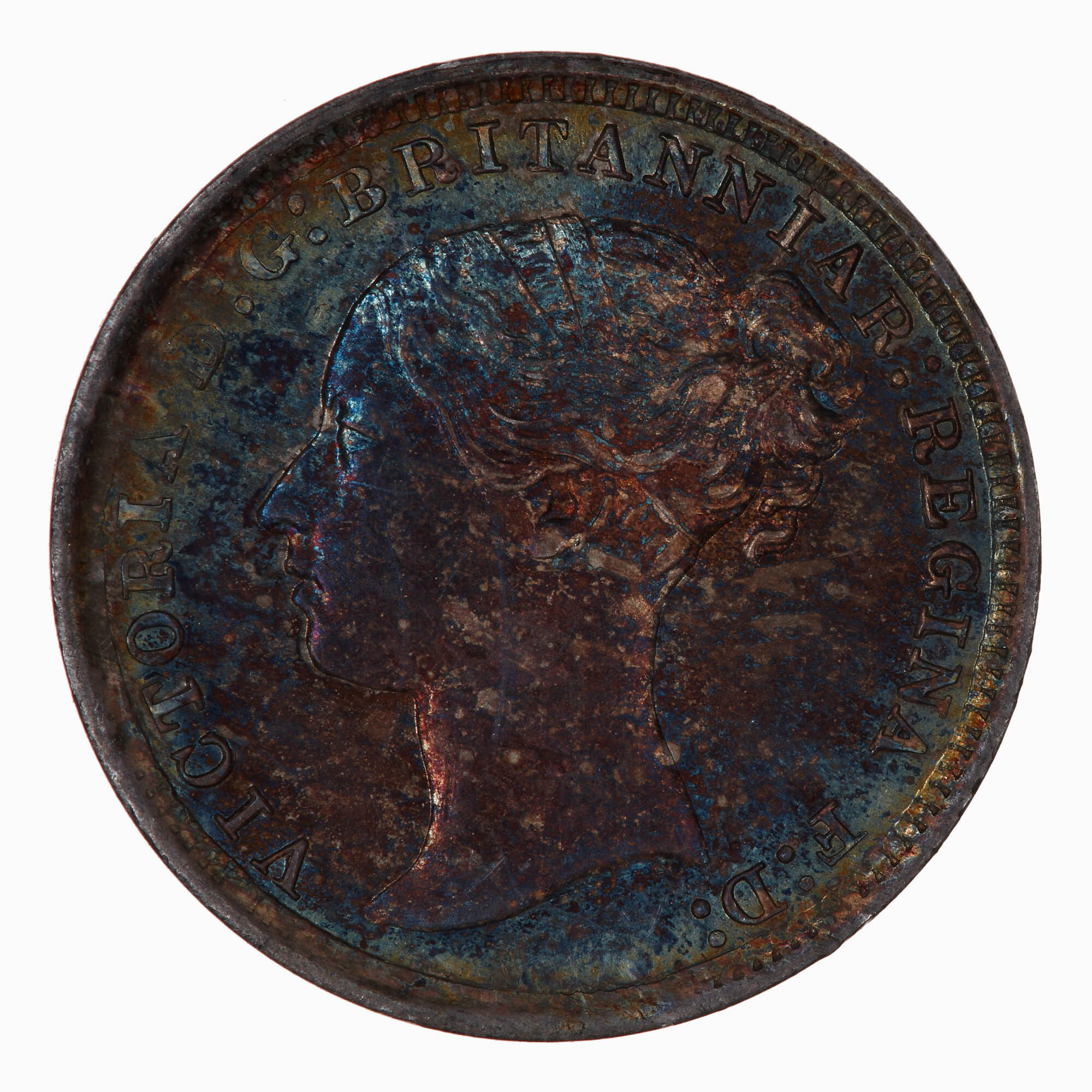 Head of the Queen facing left, ribbon in hair; around, VICTORIA D: G: BRITANNIAR: REGINA F: D: