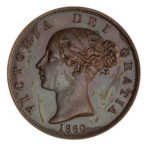 Head of Queen Victoria facing left, plain bands in hair; below, 1860; around above, VICTORIA DEI GRATIA; the artist's initials W:W. incuse on neck truncation