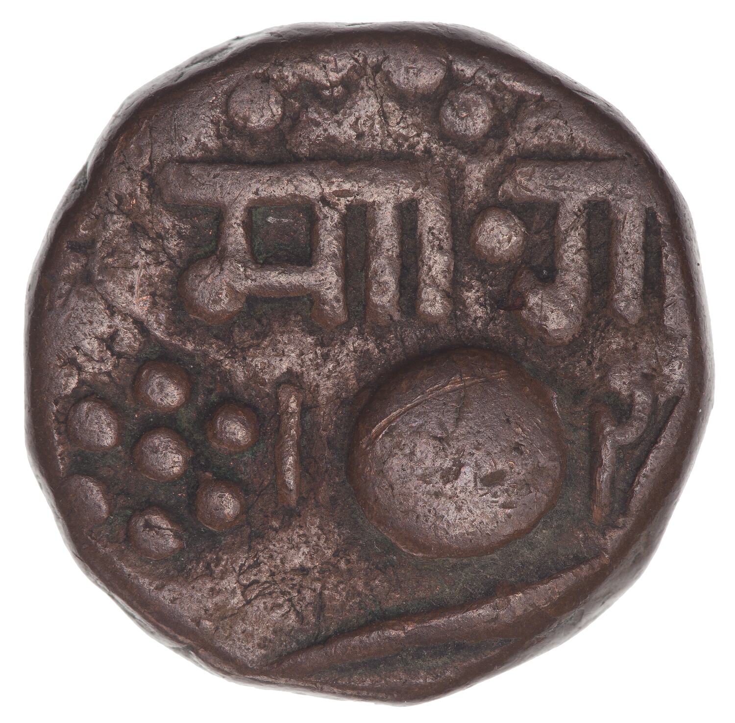 Struck off-centre, circle with Negari legend above, blade of scimitar below; plus three numerals of date, 1 to left and 28 to right of circle are present