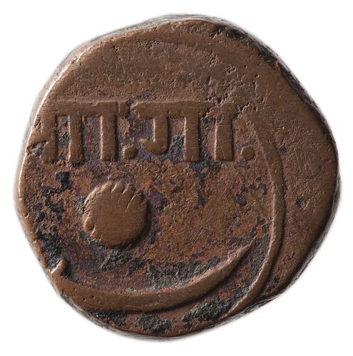 At centre within a line circle, a ball; above, Nagari legend (Transliteration: Sa Ga); below, scimitar.
