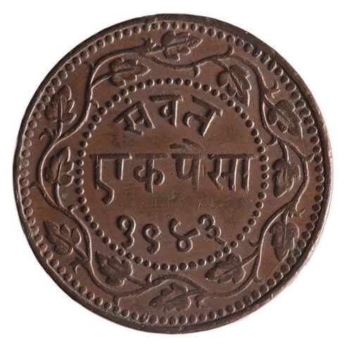 Copper 1 Paisa coin issued by the Gaekwad Maharaja of Baroda, Sayaji Rao III