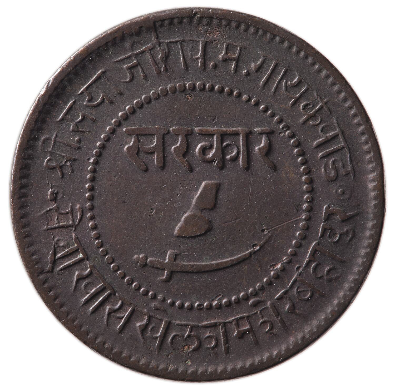 The date on this coins is given according to the Vikram (or Bikram) Samvat calander which is about 56 years 8 1/2 months ahead of the Christian era. The employment of the scimitar on Baroda coinage is a normal dynastic symbol. However, the cow's hoof as a pictorial design is new. The dynastic name Gaekwad is derived from their humble origins and means 'cow herd', perhaps it relates to this.