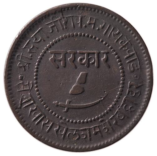 Copper 1 Paisa coin issued by the Gaekwad Maharaja of Baroda, Sayaji Rao III