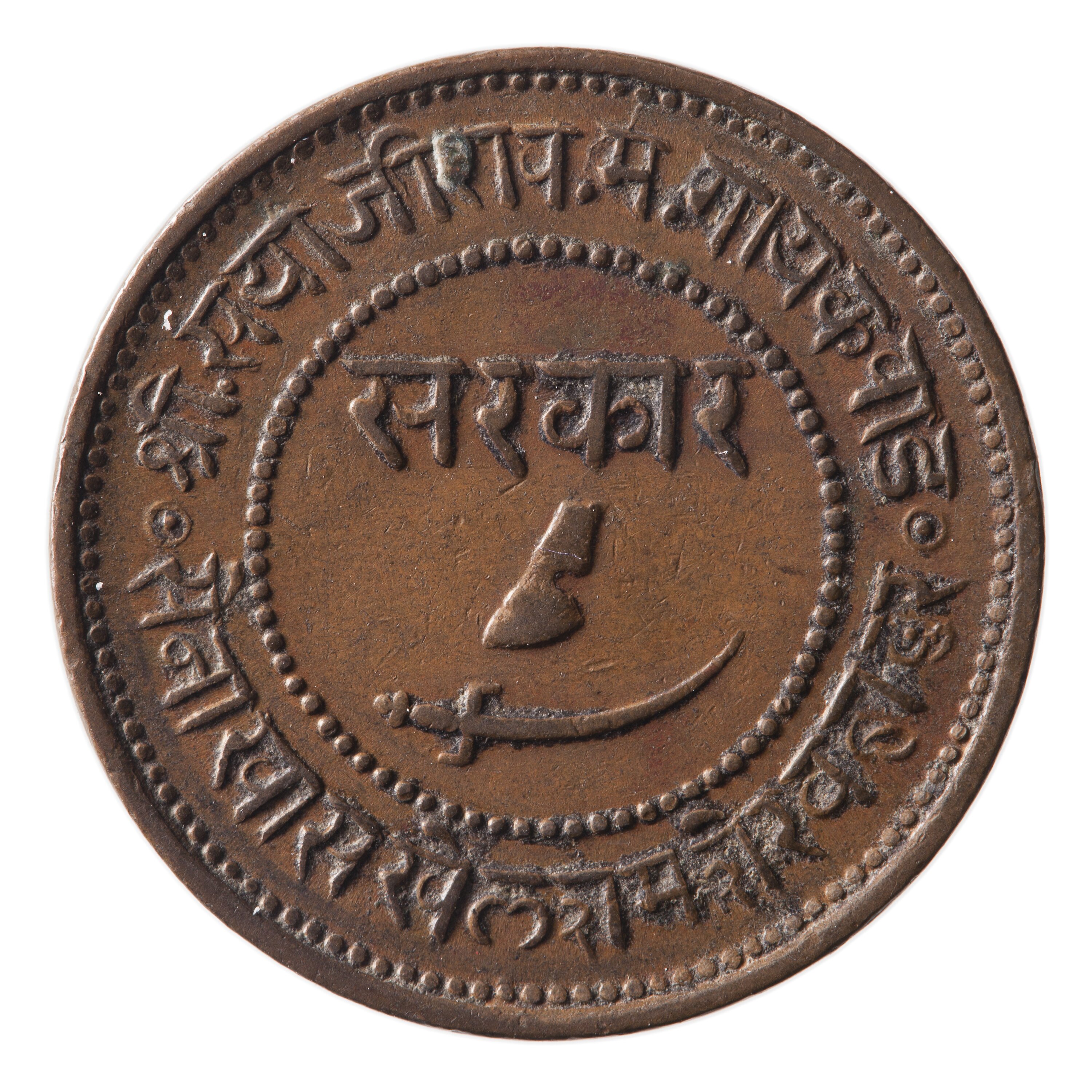 At centre within a circle of beads, cow's hoof; above Negari legend "sakar"; below, scimitar; around Negari legend