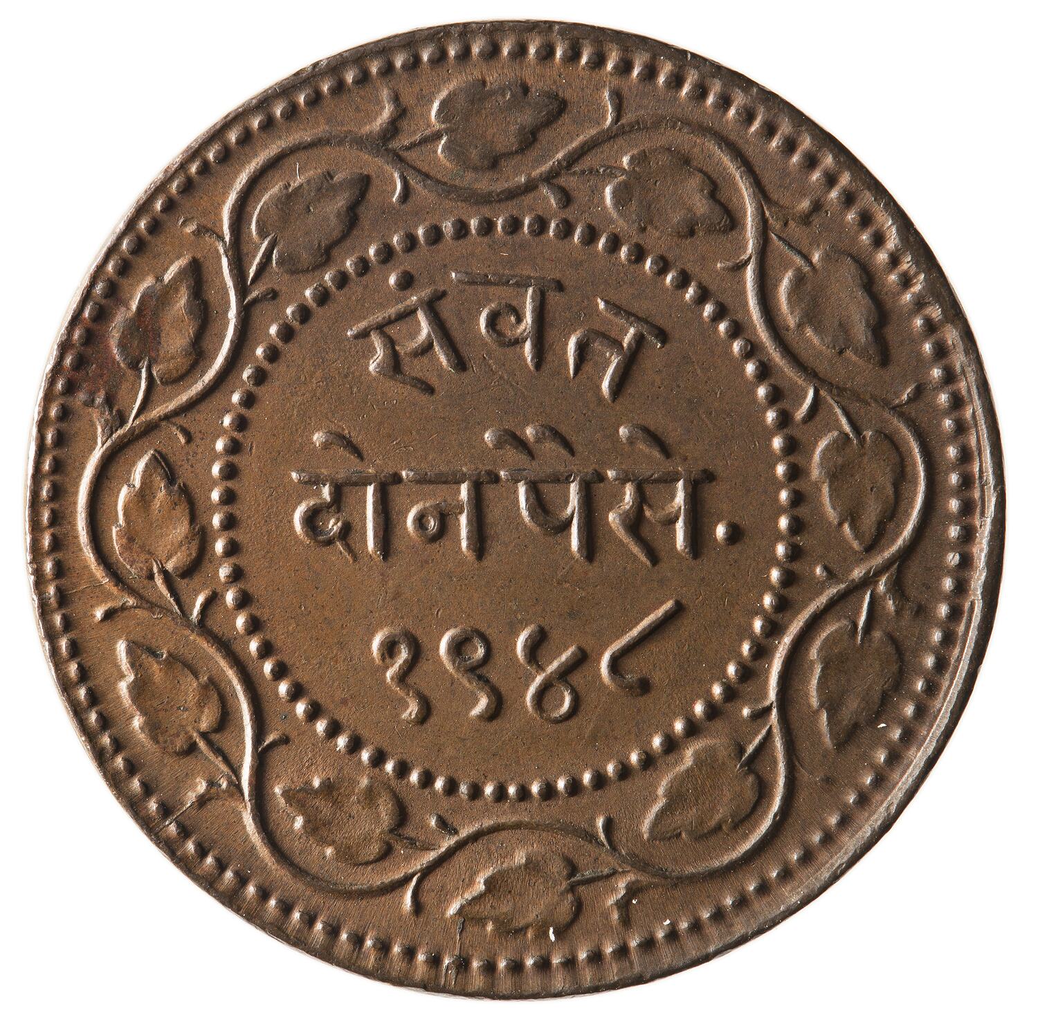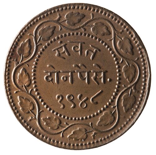 2 Paisa, Milled Coinage, Issued by Sayaji Rao III, Baroda Princely State, India, VS 1948 (1891). Mint not recorded.