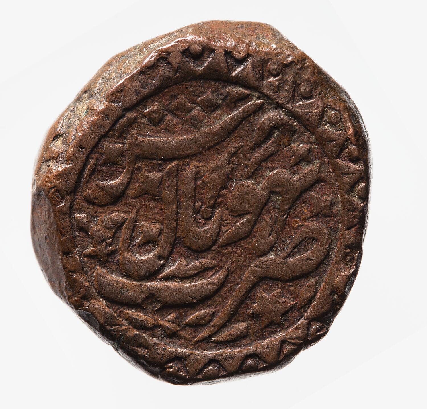 Within a border of beads, legend in Persian giving the mint name - Bhopal