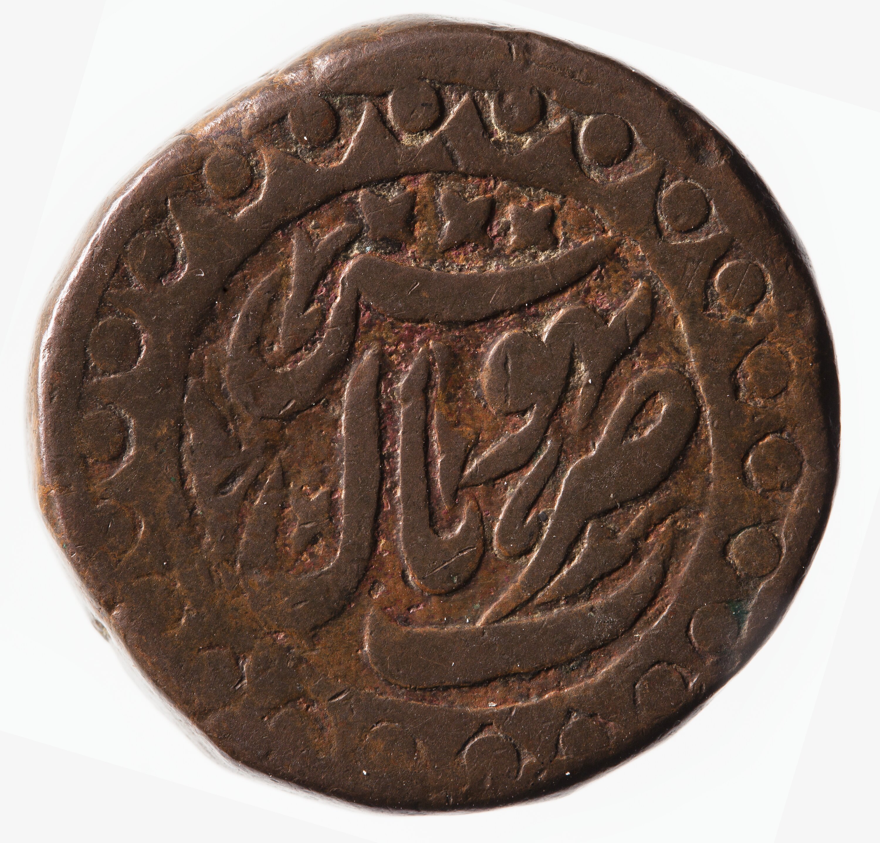 Within a border of beads, legend in Persian giving the mint name - Bhopal