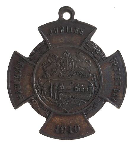 Plain (edge) At centre a scene of a steam train crossing the Yarra river below the Royal arms; on cross arms, HAWTHORN JUBILEE EMPIRE DAY 1910 (obverse) 1860 / TO / COMMEMORATE / THE JUBILEE OF HAWTHORN / MAYOR, CR. D.H. DUREAU, J.P. / 1910 (reverse)