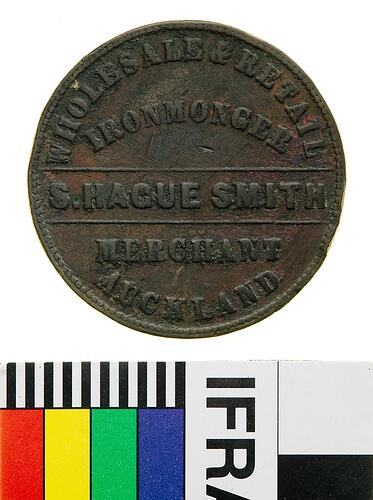 A round copper token (34 mm diameter). The token features the name, address and business of the issuer: S. Hague Smith, Auckland, wholesale and retail Ironmonger. The reverse features a profile head of Prince Albert and gives the dates of his birth and death - August 26 1819 to 14 December 1861.