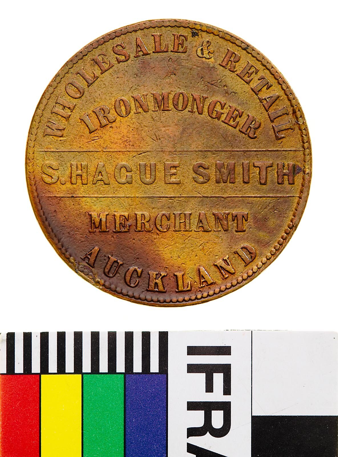 A round copper token (34 mm diameter). The token features the name, address and business of the issuer: S. Hague Smith, Auckland, wholesale and retail Ironmonger. The reverse features a profile head of Prince Albert and gives the dates of his birth and death - August 26 1819 to 14 December 1861. This token has been cleaned and varnished