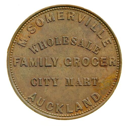 A round copper token (34 mm diameter). The token features the name, address and business of the issuer: M. Somerville, City Mart, Auckland, whilseale family grocer. The reverse features a bouquet of rose, thistle and shamrock with the legend NEW ZEALAND 1857.