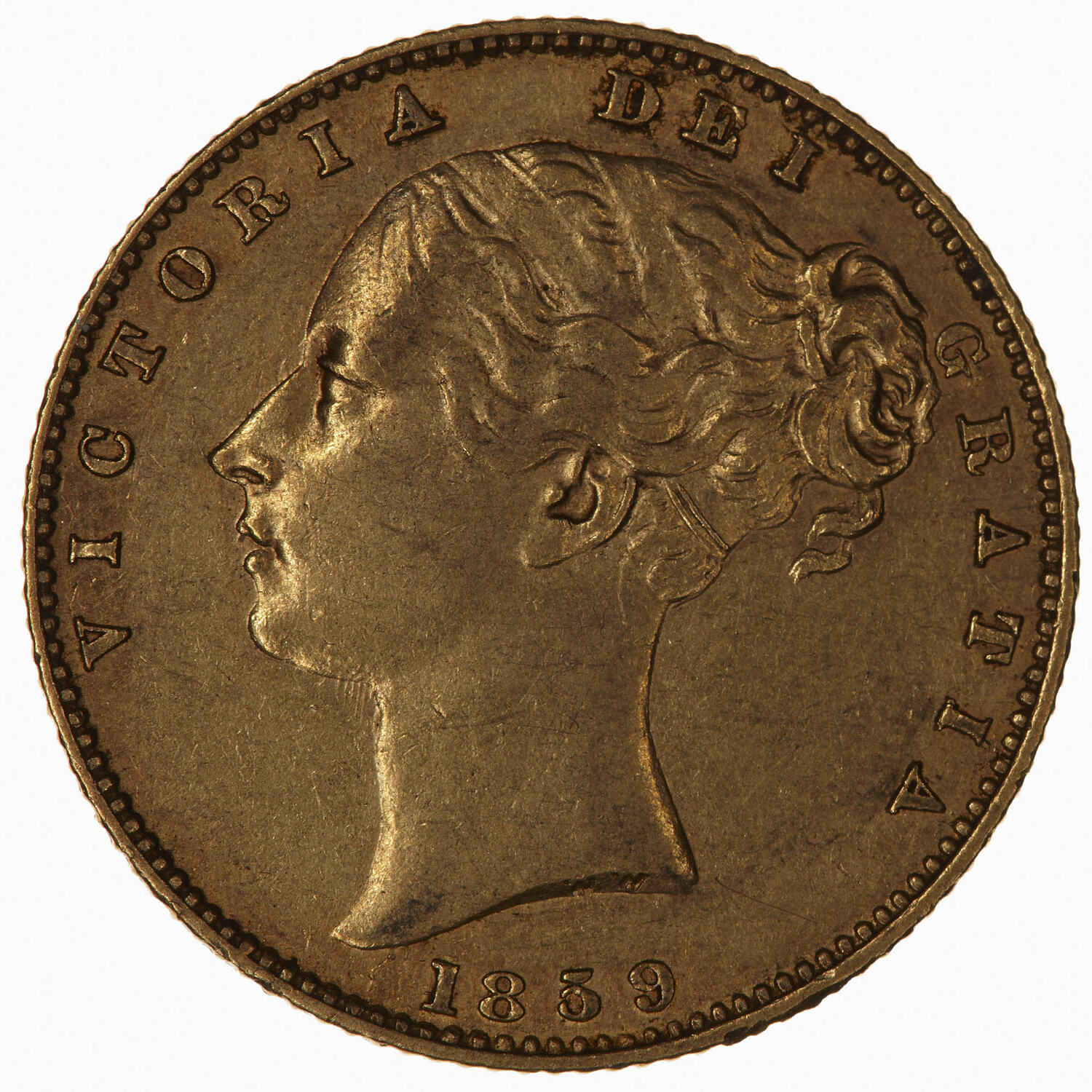 Head of the Queen facing left wearing ribbon in her hair (extra line behind ear); around, VICTORIA DEI GRATIA; below, 1859