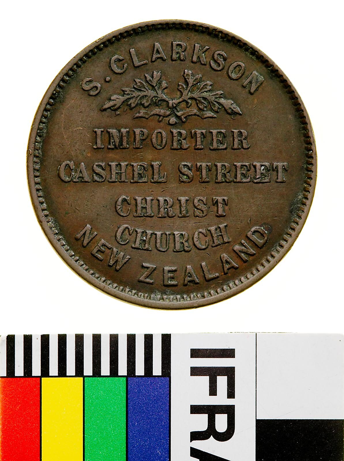 Obverse: S. CLARKSON IMPORTER CASHEL STREET CHRIST CHURCH NEW ZEALAND Reverse: NEW ZEALAND 1875