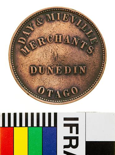 Obverse: DAY & MIEVILLE MERCHANTS DUNEDIN OTAGO Reverse: NEW ZEALAND 1857