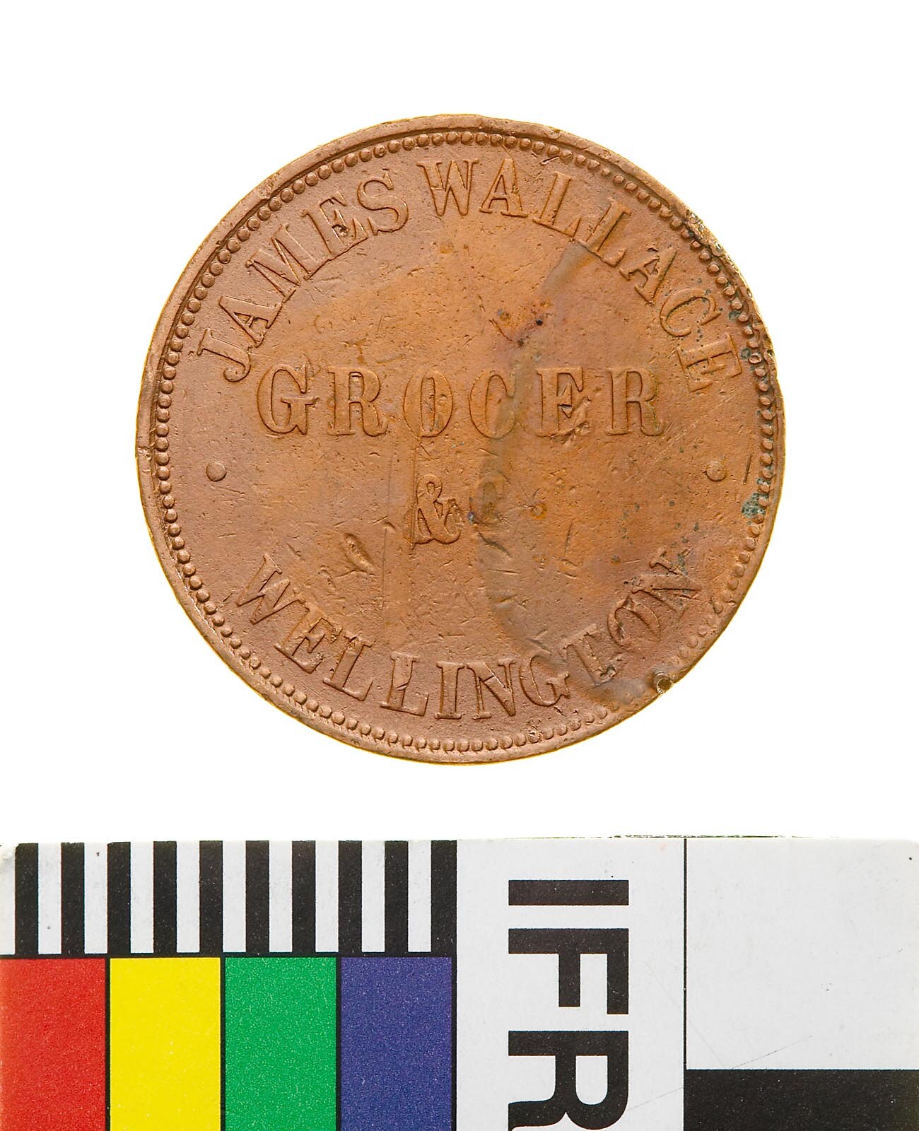 A round copper token (28 mm diameter). The piece features the name, address and business of the issuer: James Wallace, Grocer, Wellington. The reverse a female figure representing Justice seated on a wool bale with legs to left but her head and upper body to front. A wine barrel lies on the ground behind her and a three-masted sailing ship sails to the right on the horizon to the left. She wears a blindfold and extends a balanced set of scales with her right hand. With her left she holds an inverted cornucopia from which fruits flow onto the ground. She wears an ancient-style of flowing dress bound at the waist, her left arm bare and right draped to near the elbow. This token has been cleaned and varnished.