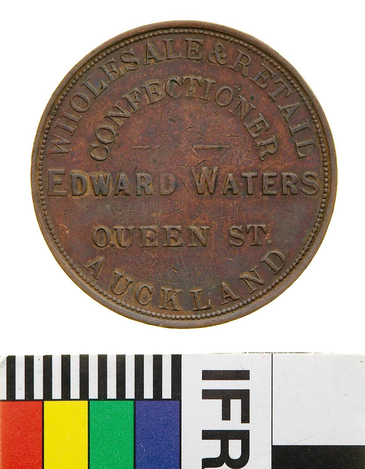 Copper One Penny Token, minted by Stokes & Martin, Melbourne. Issued by Edward Waters, Confectioner, Auckland, circa 1872. The reverse die was cut by Julius Hogarth. Edward Waters owned a Coffee Palace (Temperance Hotel) in Auckland, which was the rendezvous of Pacific Island Traders and sailors. He was interested in pearl fishing and was well known to the roving South Sea mariners. He was also a wholesale and retail confectioner in which capacity he issued his penny tokens.