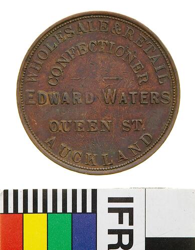 A round copper token (34 mm diameter). The token features the name, address and business of the issuer: William Waters, confectioner, Queen Street, Auckland. The reverse features a profile bust of a Maori. This token has been cleaned.