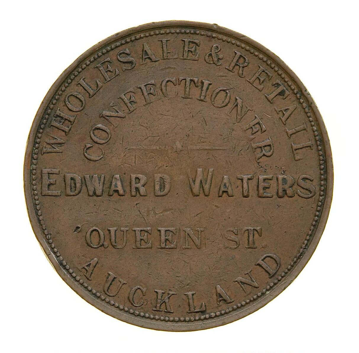 Copper One Penny Token, minted by Stokes & Martin, Melbourne. Issued by Edward Waters, Confectioner, Auckland, circa 1872. The reverse die was cut by Julius Hogarth. Edward Waters owned a Coffee Palace (Temperance Hotel) in Auckland, which was the rendezvous of Pacific Island Traders and sailors. He was interested in pearl fishing and was well known to the roving South Sea mariners. He was also a wholesale and retail confectioner in which capacity he issued his penny tokens.