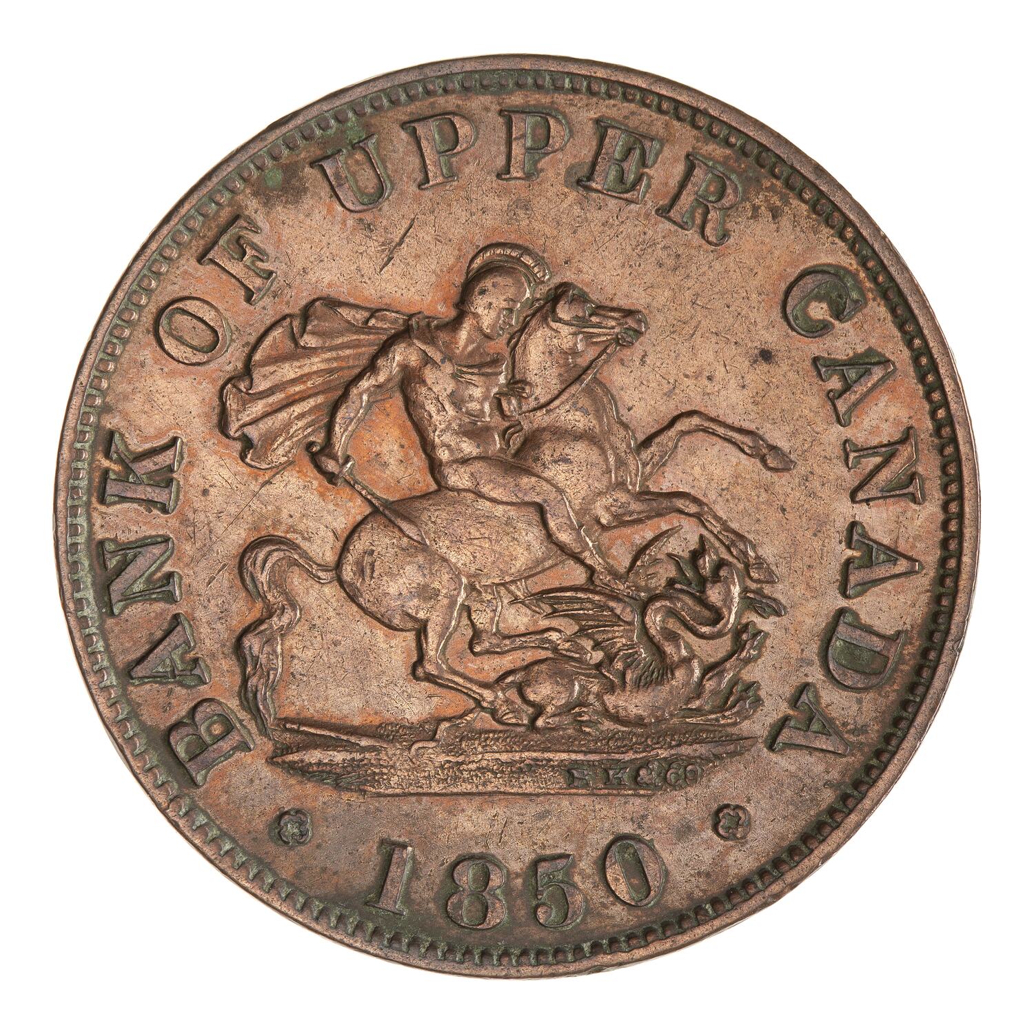 St. George on horseback facing right slaying a dragon with a sword; around above, BANK OF UPPER CANADA; in exergue between two roses, 1850; the letters R.K. & Co. on in the right side of the ground line represent the firm Row, Kentish & Co., London through whom the order for the production of the tokens had been placed.
