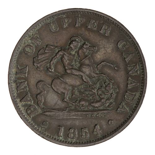 St. George on horseback facing right slaying a dragon with a sword; around above, BANK OF UPPER CANADA; in exergue between two roses, 1854; the letters R.K. & Co. on in the right side of the ground line represent the firm Row, Kentish & Co., London through whom the order for the production of the tokens had been placed.