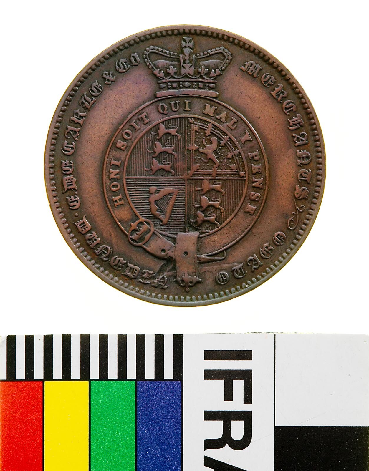 Obverse: E DE CARLE & CO MERCHANTS DUNEDIN OTAGO HONI SOIT QUI MAL Y PENSE Reverse: VIVAT REGINA 1862
