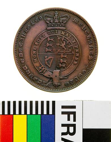 A round copper token (31 mm diameter). The token features the name, address and business of the issuer: E. DeCarle & Co., Merchants, Dunedin, Otago around the British Royal Arms. The reverse depicts a female figure representing Justice seated on a wool bale with legs to left but her head and upper body to front. A wine barrel lies on the ground behind her and a three-masted sailing ship sails away to the leftt on the horizon to the left. She wears a blindfold and extends a balanced set of scales with her right hand. With her left she holds an inverted cornucopia from which fruits flow onto the ground. She wears an ancient-style of flowing dress bound at the waist, her left arm bare and right draped to near the elbow. This token has been cleaned.
