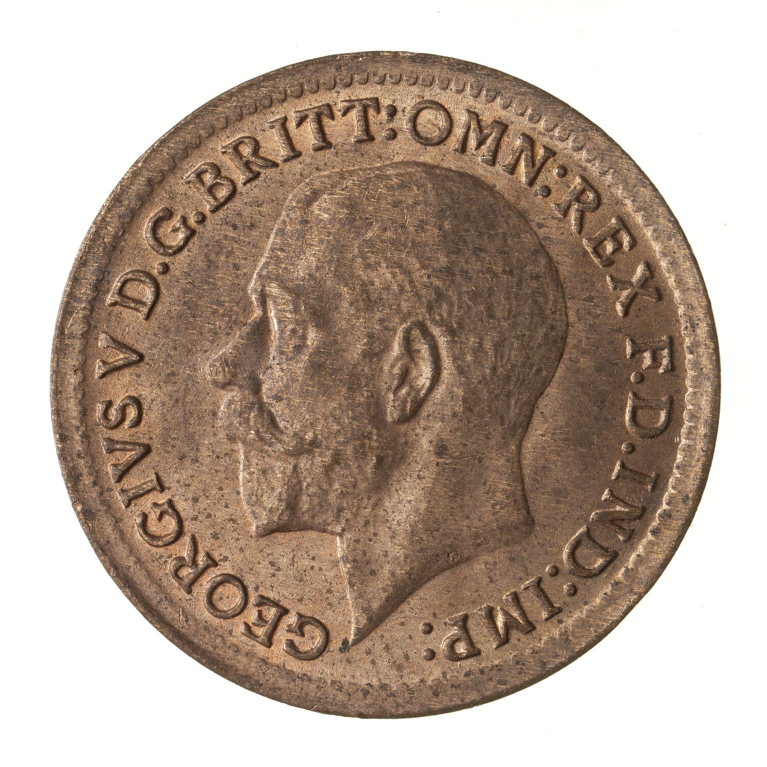 Bare head of the king facing left; around, GEORGIVS V D. G. BRITT: OMN: REX F. D. IND: IMP:; the artist's initials BM on neck truncation