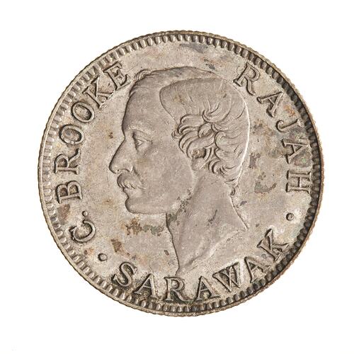 Head of Charles Brooke facing left; around, C. BROOKE RAJAH . SARAWAK .