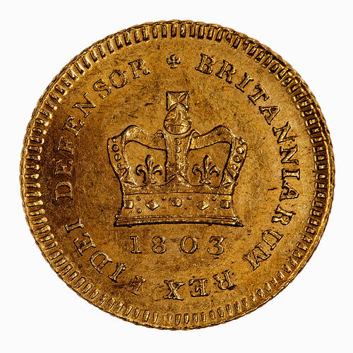 At centre a crown above the date 1803; around, BRITANNIARUM REX FIDEI DEFENSOR