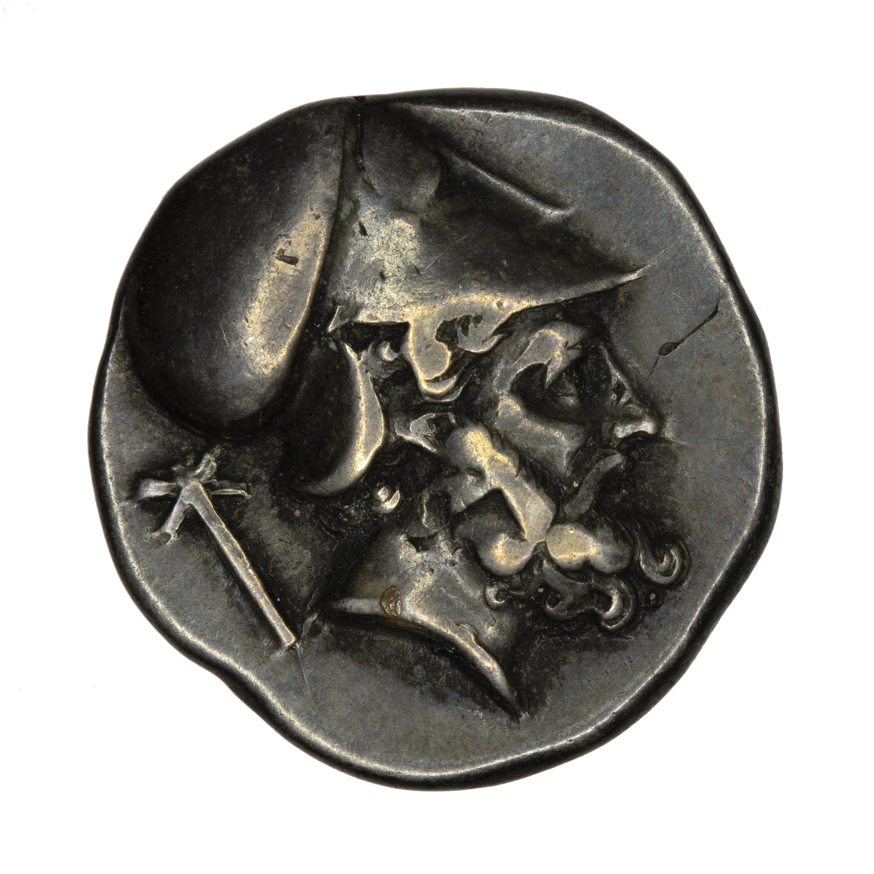 Head of Leucippus in Corinthian helmet facing right; behind, a cross headed torch.