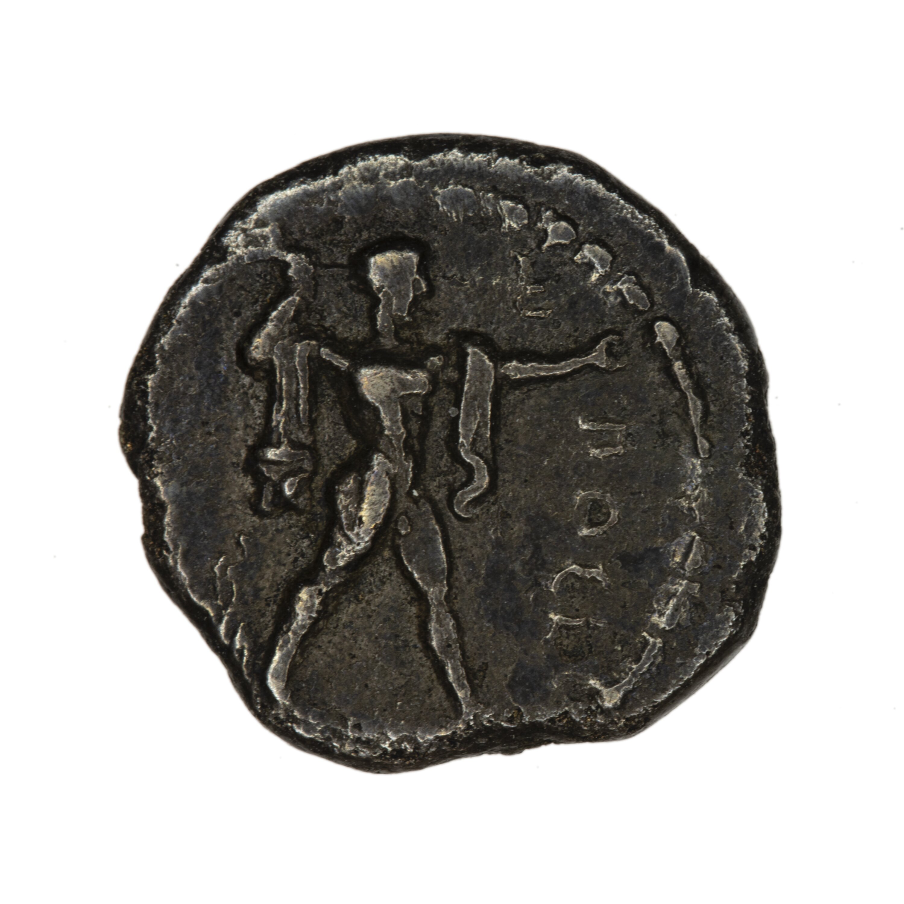 A silver diobol (or 1/6th stater) coin from the town of Poseidonia in Lucania, Italy circa 480 BCE.