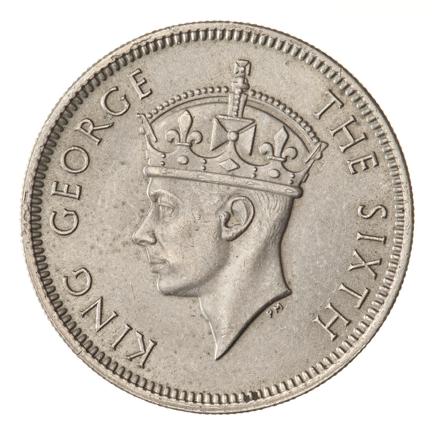 Crowned head of the King facing left; around, KING GEORGE VI THE SIXTH; artist's initials, PM, below neck