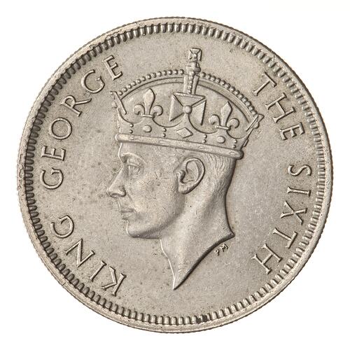 Although this coin bears the date 1950, it could have been struck any time from that year up until 1952. On 1 January 1951 the Board of Commissioners of Currency, Malaya ceased to exist. It was replaced by the new Board of Commissioners of Currency, Malaya and British Borneo on 1 January 1952 but during the interim the old Board name and date 1950 was continued on all coins produced. Then the death of George VI further delayed reference to the new Board with the urgent need for new obverses for Elizabeth II, so again all production during 1952 was of the 1950 design. It was not until the 1953 issue with the new obverse of Elizabeth II till reference to the new Board appears on the reverse of the coins; in that year they began to bear the legend MALAYA AND BRITISH BORNEO.