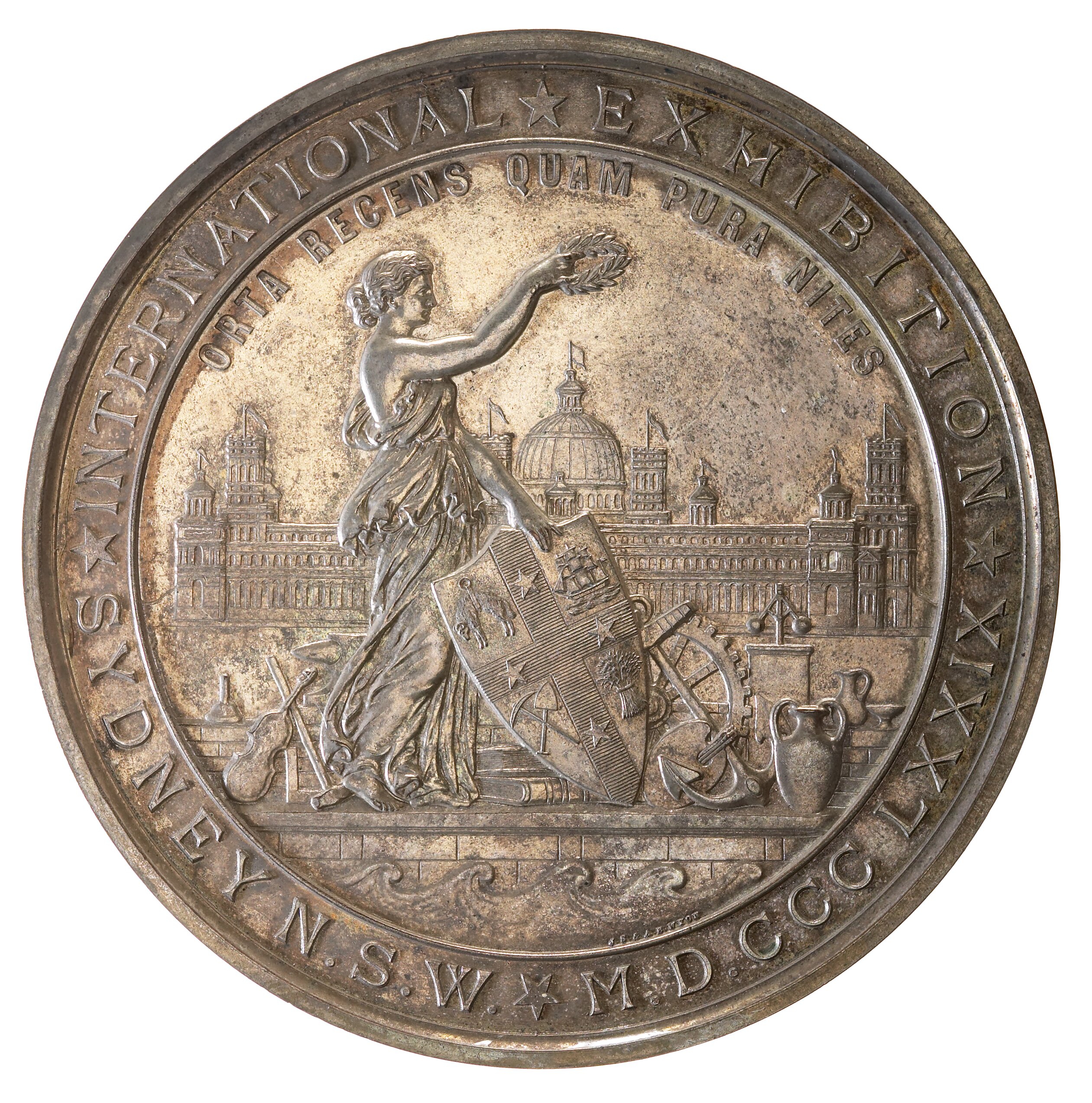 Figure of New South Wales surrounded by works of industry before exhibition building; around, * INTERNATIONAL * EXHIBITION * SYDNEY N.S.W.* M.D.CCC.LXXIX in exergue, waves, below these waves in tiny letters the artists names, J.S. & A.B. WYON
